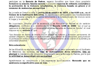 En cumplimiento del Decreto 4807 de 2011 y la Política de Gratuidad Educativa establecida por el Ministerio de Educación Nacional, la Institución Educativa [Nombre del Colegio] informa a la comunidad que la educación en los niveles de preescolar, básica y media es totalmente gratuita. No se realizan cobros por matrícula, pensiones, servicios académicos o actividades obligatorias.