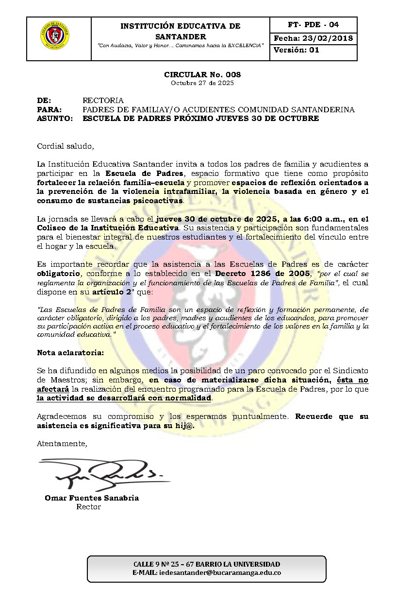 El 19 de noviembre, el Consejo Estudiantil, la Personera de los Estudiantes, la Contralora Escolar y el Representante de los estudiantes en el Consejo Directivo, se reunieron con el Rector de la Institución Educativa, Omar Fuentes Sanabria. La reunión permitió