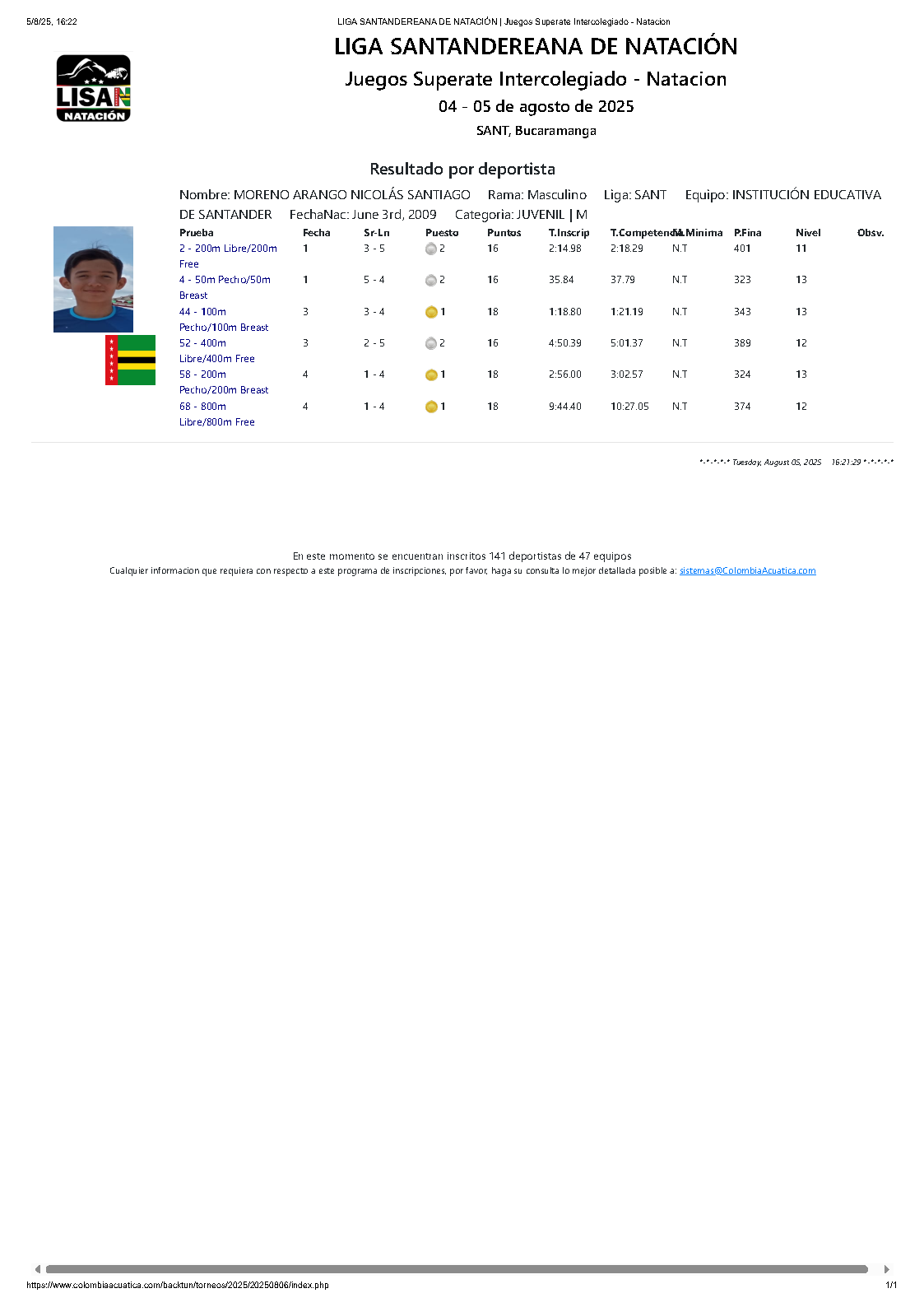 Destacada participación de Nicolás Santiago Moreno Arango en los Juegos Supérate Intercolegiados de Natación 2025